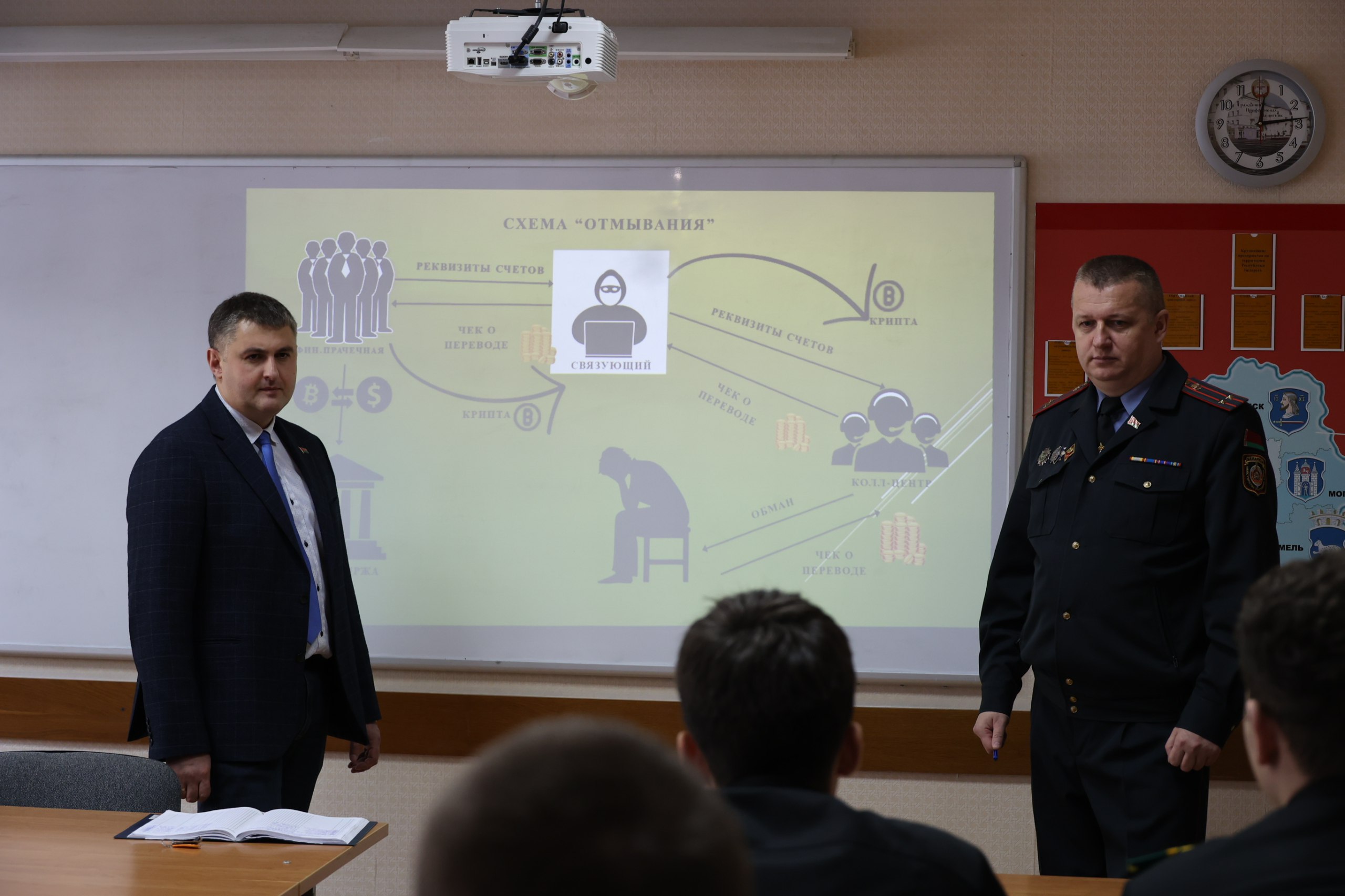 Заместитель начальника третьего управления Департамента финансовых расследований Комитета государственного контроля, подполковник финансовой милиции Александр Лебедев рассказал будущим офицерам об организации и тактике выявления средств, полученных преступным путем. На основе реальных случаев из практики на учебном занятии разобрали типичные схемы «отмывания» денег, признаки подозрительных транзакций и алгоритмы реагирования.