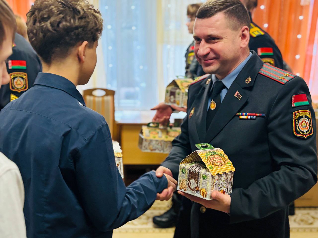 Курсанты и руководство факультета: начальник факультета криминальной милиции Андрей Говорако, заместитель начальника факультета по учебной работе Сергей Варихов и помощник начальника факультета по работе с молодежью Виктор Гузаревич поздравили ребят, для которых организована праздничная программа.