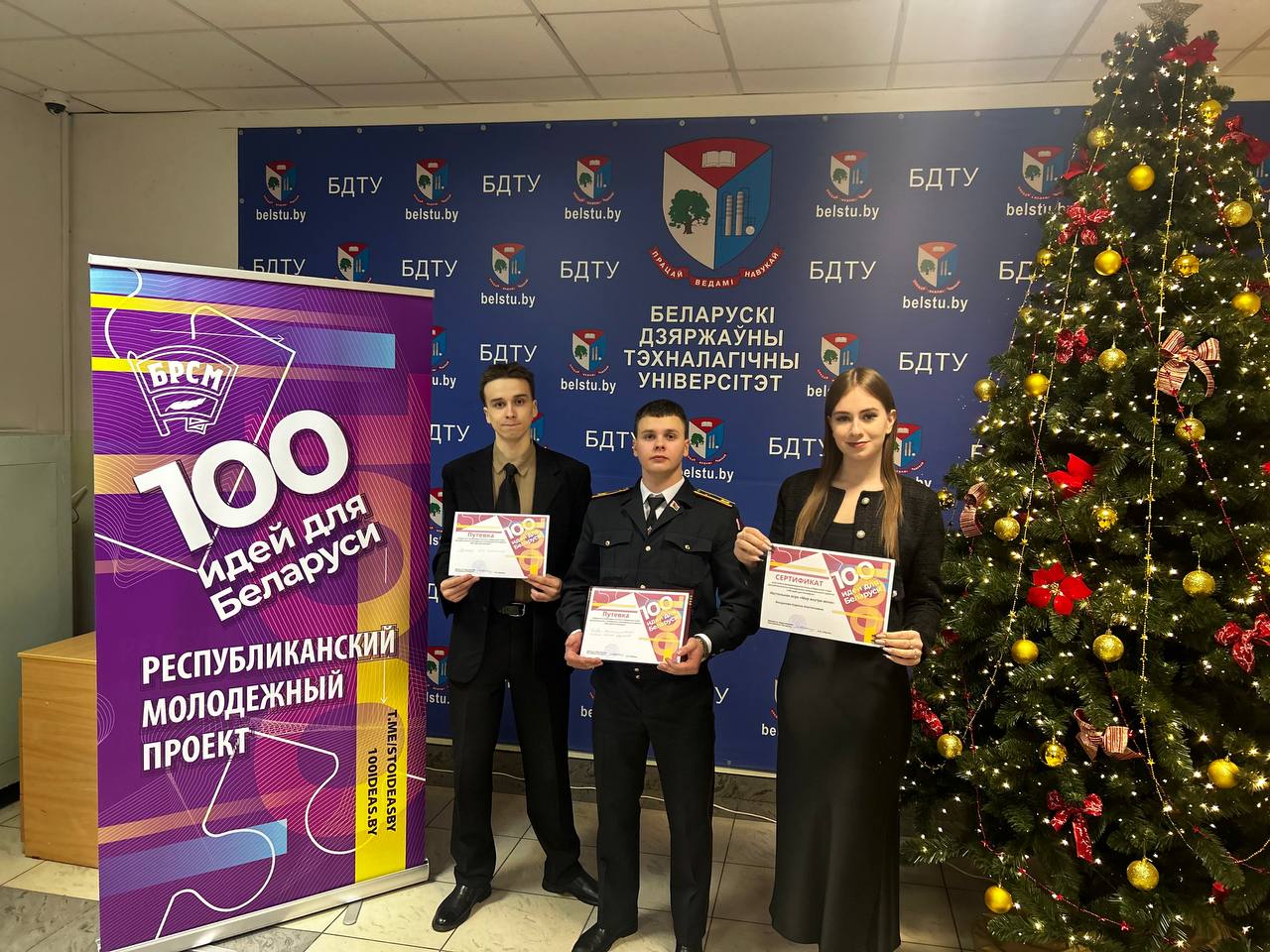 Республиканский молодежный конкурс «100 идей для Беларуси» — это проект Белорусского республиканского союза молодежи, который дает возможность молодым ученым, изобретателям и предпринимателям презентовать свои инновационные идеи и проекты. Участие в конкурсе - возможность для талантливой молодежи заявить о себе, получить экспертные оценки своим разработкам, найти поддержку для дальнейшего развития и внедрения. Участники конкурса делают акцент на разработки и решения, которые способствуют технологическому суверенитету страны, импортозамещению и развитию отечественных высокотехнологичных производств.