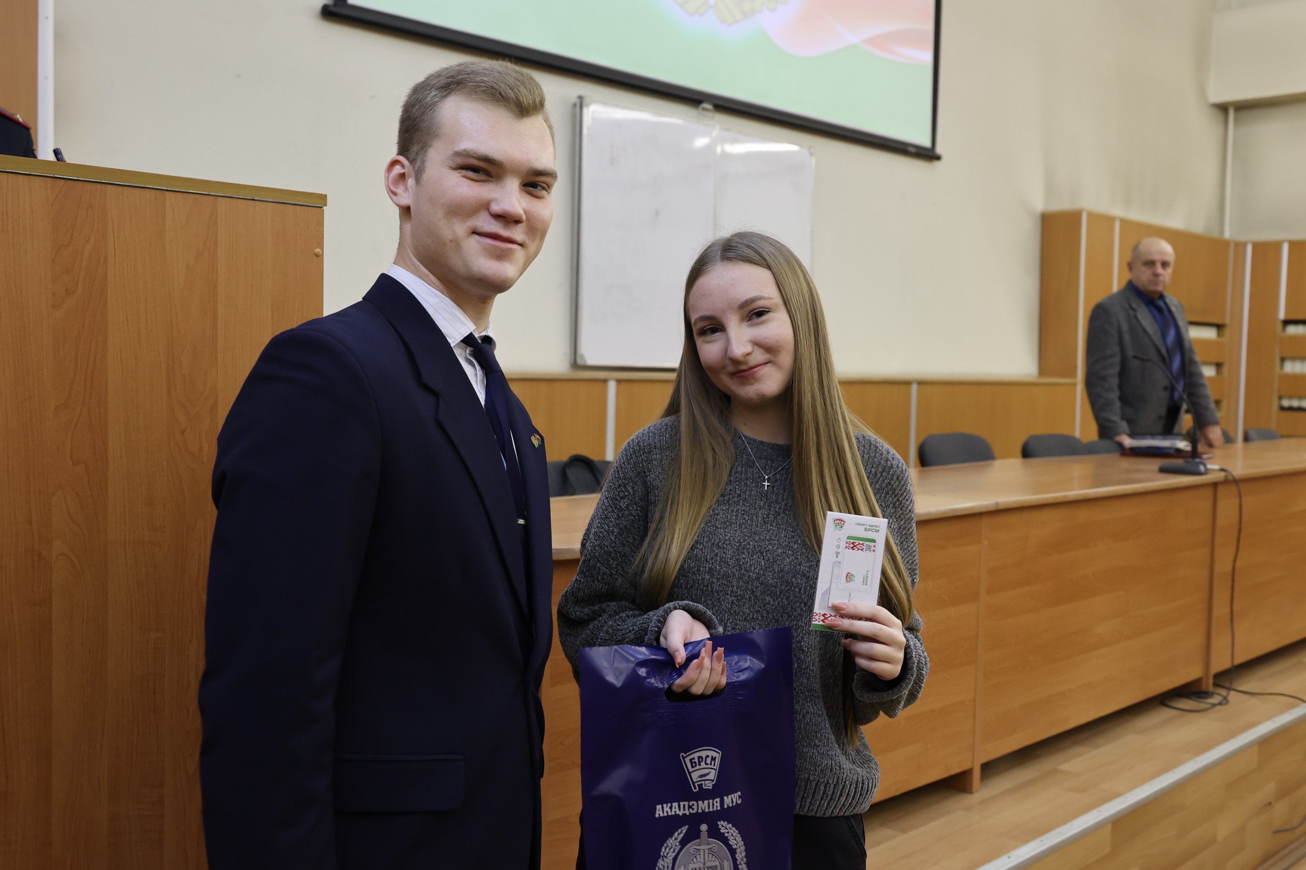 На встрече со студентами выступил секретарь первички БРСМ Дмитрий Евтух, поздравил ребят со вступлением в молодежную организацию и пожелал активных и интересных лет обучения в столичном милицейском вузе.
