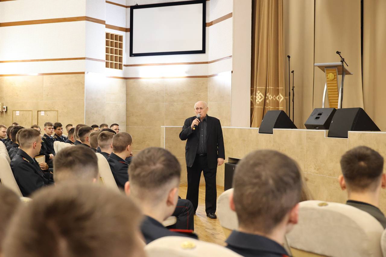 Народный артист рассказал о богатом творческом пути, с курсантами и офицерами вспомнили легендарные песни: на экране прозвучали хиты прошлого, а под аккомпанемент спели современные - звучала «Царица» и «Любимка», «Трава у дома» и «Седая ночь», десятки современных композиций.