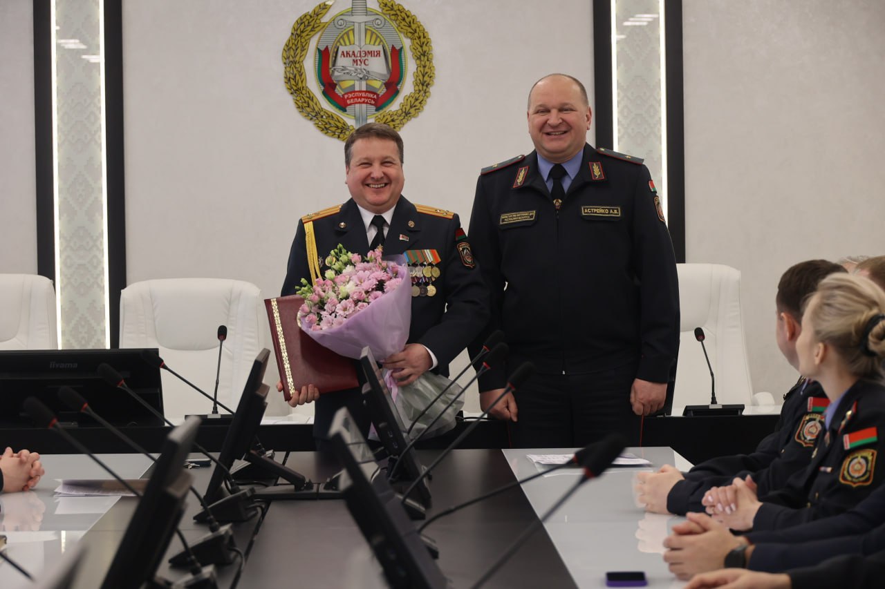 Слова признательности за многолетнюю добросовестную службу адресовал Михаилу Александровичу руководитель академии генерал-майор милиции Александр Астрейко и первый заместитель начальника вуза полковник милиции Алексей Башан. С новым этапом в жизни виновника торжества поздравили коллеги, руководители кафедр и подразделений.